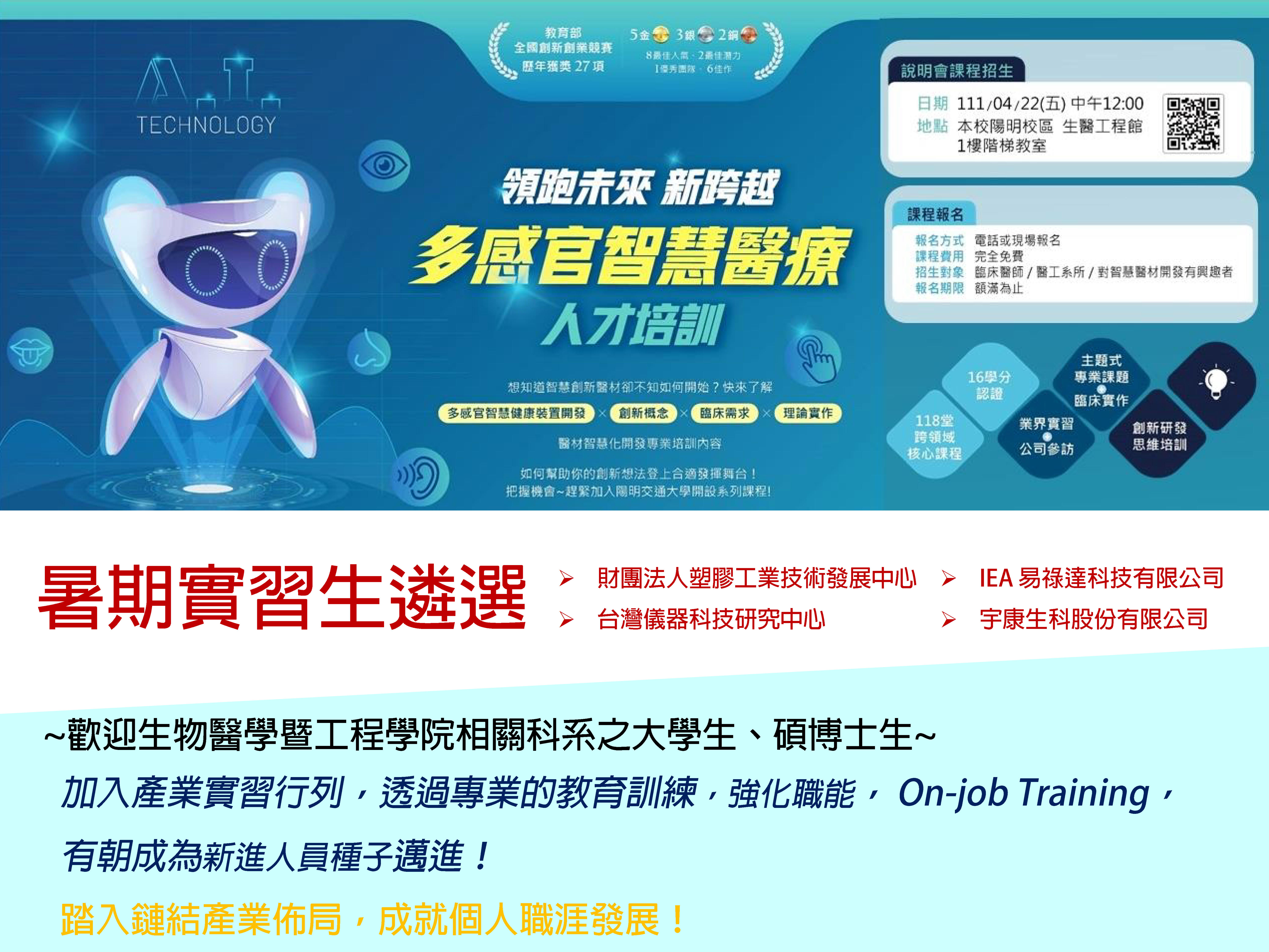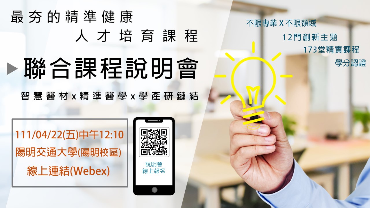 今年首辦「精準健康跨領域人才培育課程」線上聯合課程說明會 智慧醫材x精準醫學x學產研鏈結實習 *惟應近日疫情嚴峻,4/22實體說明會更改”線上辦理”,如有造成不便,敬請見諒! ~~感謝您對【精準健康跨領域人才培育:聯合說明會】報名與支持,歡迎線上踴躍參與~~ #多感官智慧醫療 #醫療植入物 #人工智慧 #大數據分析 #AI藥物研發應用 #智慧工程實作 #暑期實習醫材醫藥 #財團法人產業 #新創公司參訪