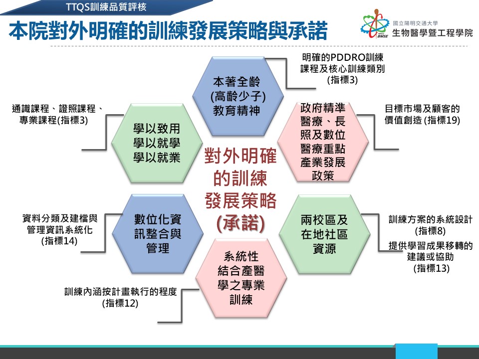 生物醫學工程學院對外明確的訓練發展策略與承諾 本著全齡(高齡少子)教育精神 政府精準醫療、長照及數位醫療重點產業發展政策 兩校區及在地社區資源 系統性結合產醫學之專業訓練 數位化資訊整合與管理 學以致用、學以就學、學以就業