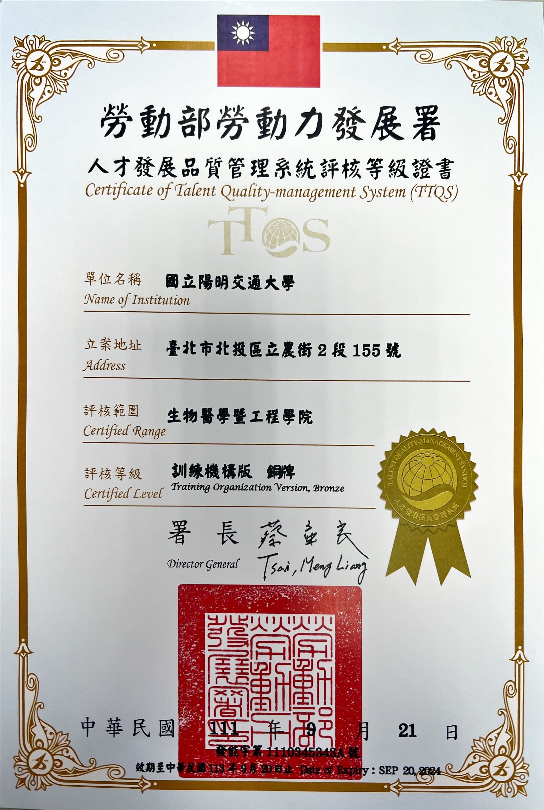 恭賀 生物醫學暨工程學院 榮獲 勞動部勞動力發展署人才發展品質管理系統評核 訓練機構銅牌!!!