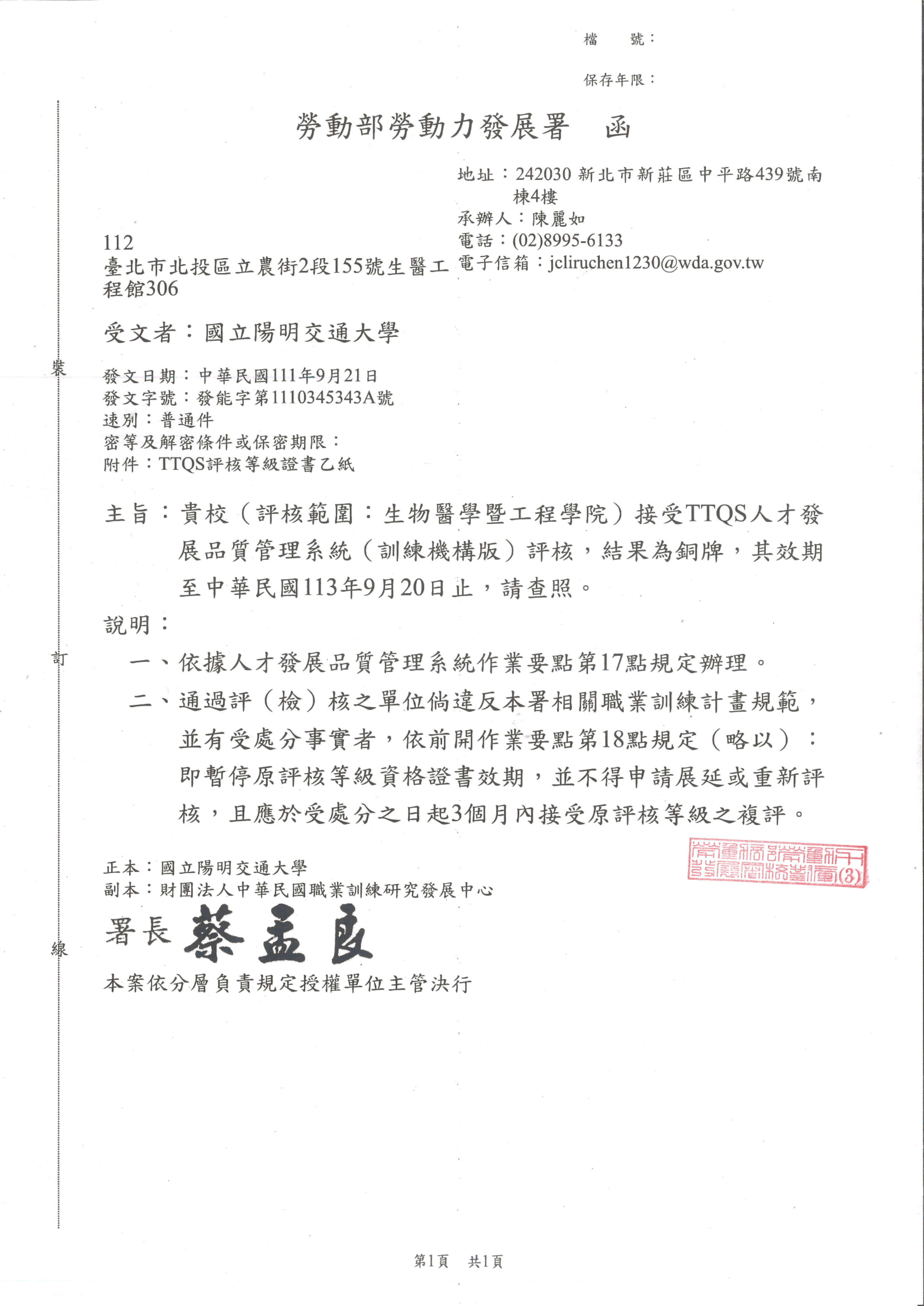 [ NYCU News ] 本院獲勞動部勞動力發展署人才發展品質管理系統評核訓練機構銅牌啟動公文