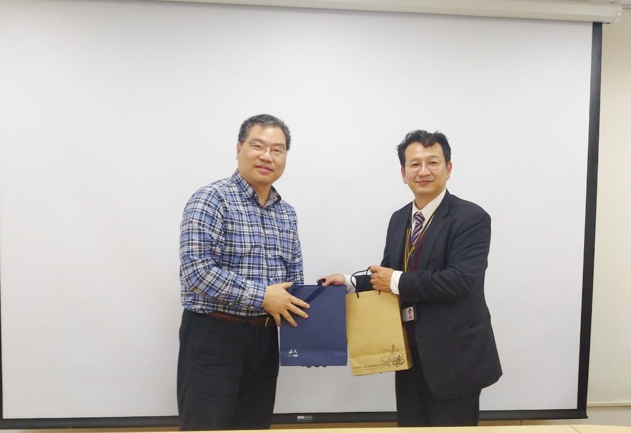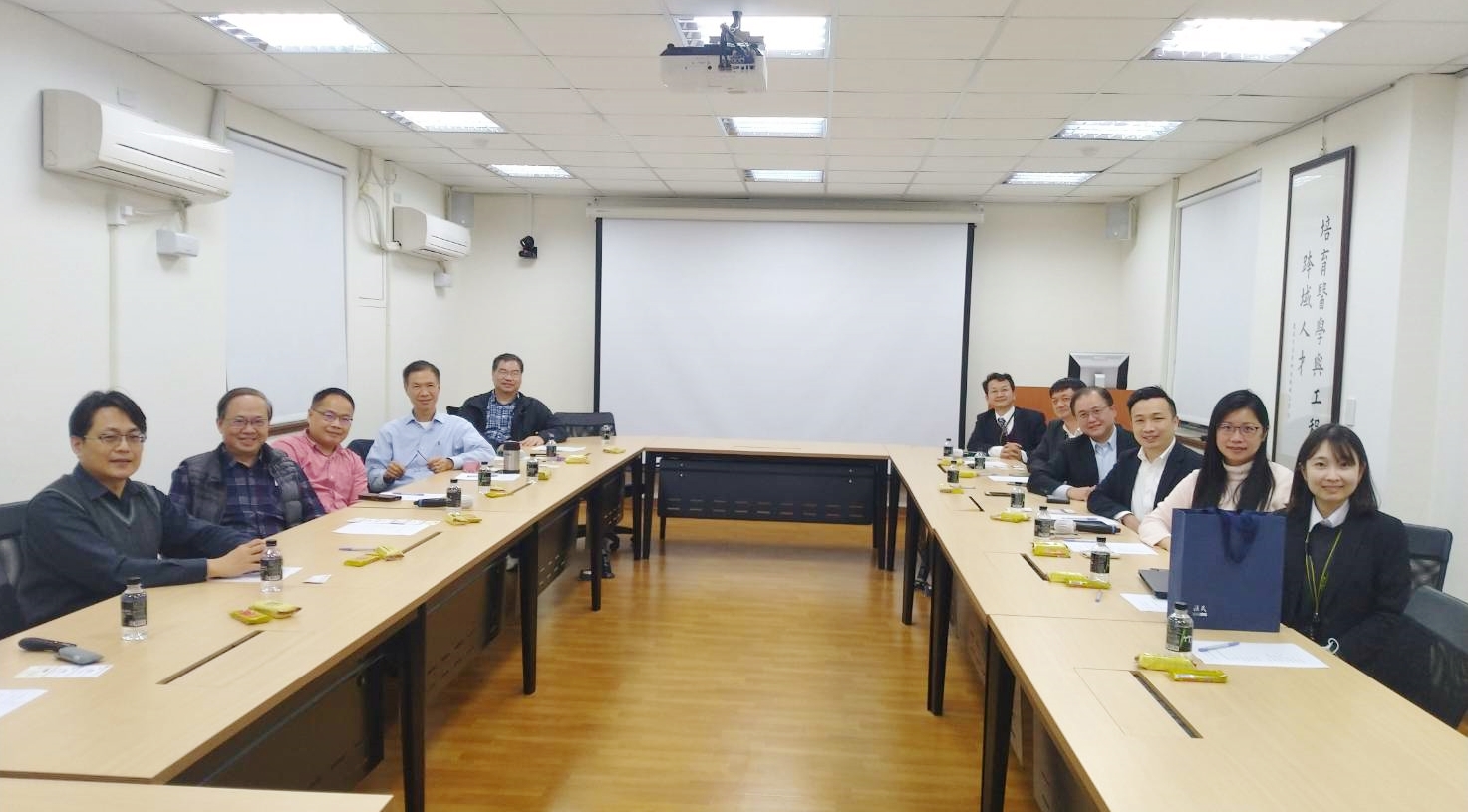 本院吳育德研發副院長與禾榮公司沈孝廉總經理代表團隊互贈紀念品 右起禾榮公司代表:沈毓翎經理室專員、戴淑眞市場銷售部副理、陳韋霖臨床醫學部經理、吳彥達事業發展中心副總經理、林正崧生產支援中心副總經理、沈孝廉總經理