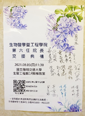 第六任生物醫學暨工程學院於8月5日上午吉時舉行交接典禮儀式,本校多位長官撥冗蒞院觀禮,場面熱鬧不已,交接典禮上林奇宏校長親自監交學院印信,六年前之今日亦是梁賡義前校長親自監交,象徵著對學院承先啟後、繼往開來的祝福。