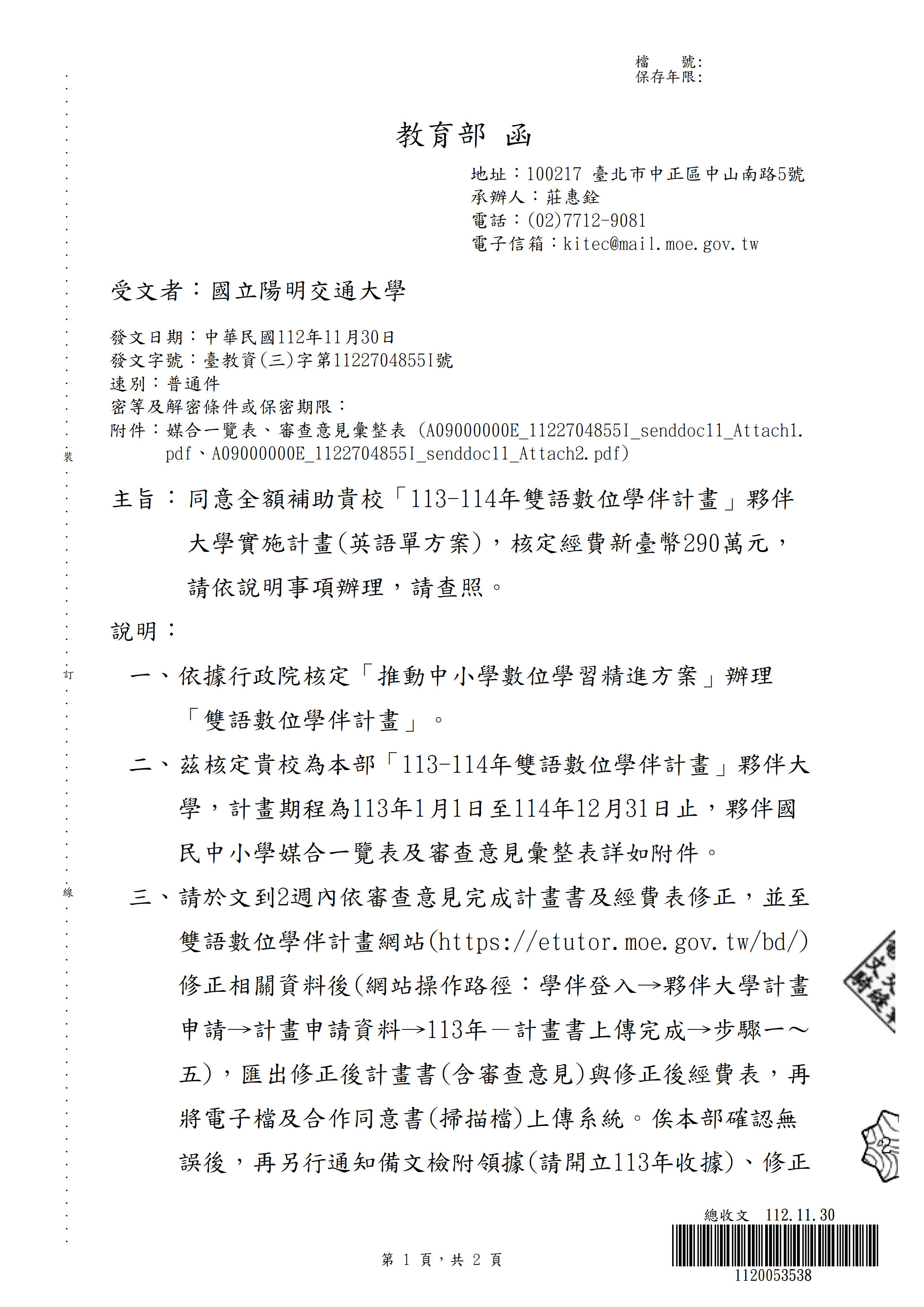 [ NYCU News ] 本院獲教育部113-114年雙語數位學伴計畫啟動公文