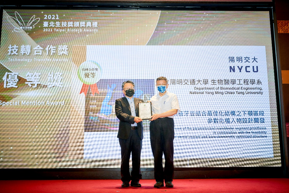 本校由生物醫學工程學系林峻立教授與台北榮民總醫院口腔外科吳政憲醫師團隊所研發之「可提供植牙並結合最佳化結構之下顎區段參數化植入物設計開發」榮獲「技轉合作優等獎」,在生技與檢測領域強敵環伺下,以醫療植入物榮獲該獎項實屬不易。該研發主題主要是整合電腦斷層掃瞄(CT)、最佳化結構設計、電腦輔助模擬分析及金屬3DP列印等技術,開發病人下顎骨大範圍缺損之客製化重建金屬植入物,具有區段咬合生物力學考量、結構輕量化設計及可搭配術後植牙等功能特色,目前已成功技轉給「安集科技股份有限公司」,待該公司通過醫療器材QMS認證後,即可進入臨床測試造福病人,使下顎大範圍缺損之患者,能獲得兼顧外觀、生物力學、咬合考量之下顎重建並提高生活品質。