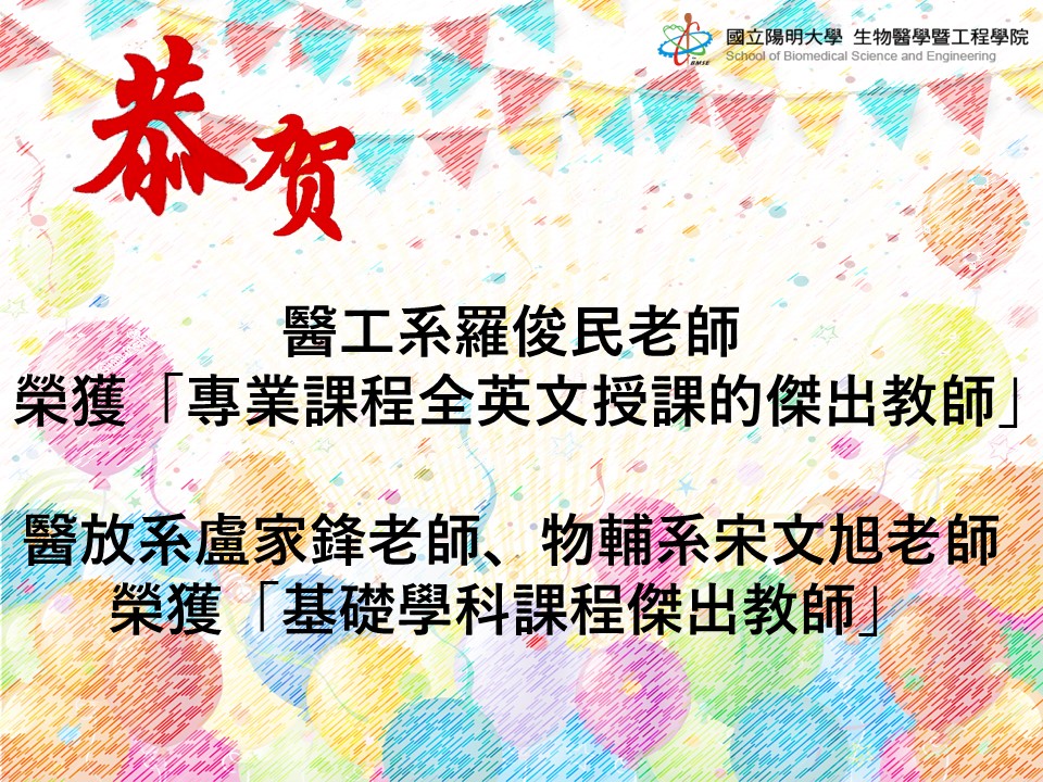 恭喜醫工系羅俊民老師榮獲"專業課程全英文授課的傑出教師",醫放系盧家鋒老師、物輔系宋文旭老師榮獲"基礎學科課程傑出教師"