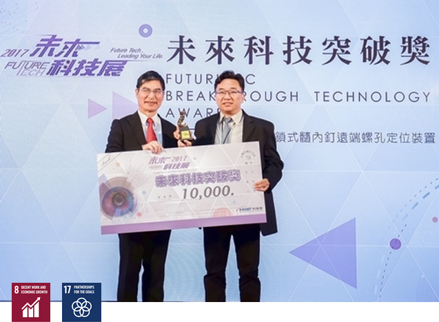 本校生醫工程系(所)朱唯勤教授團隊,以「交鎖式髓內釘遠端螺孔定位裝置(IntraMedullary Endo-Transilluminating﹝iMET﹞Device)」參加「2017未來科技展」,榮獲「未來科技突破獎」以及「最佳人氣技術獎」雙料獎項的肯定。