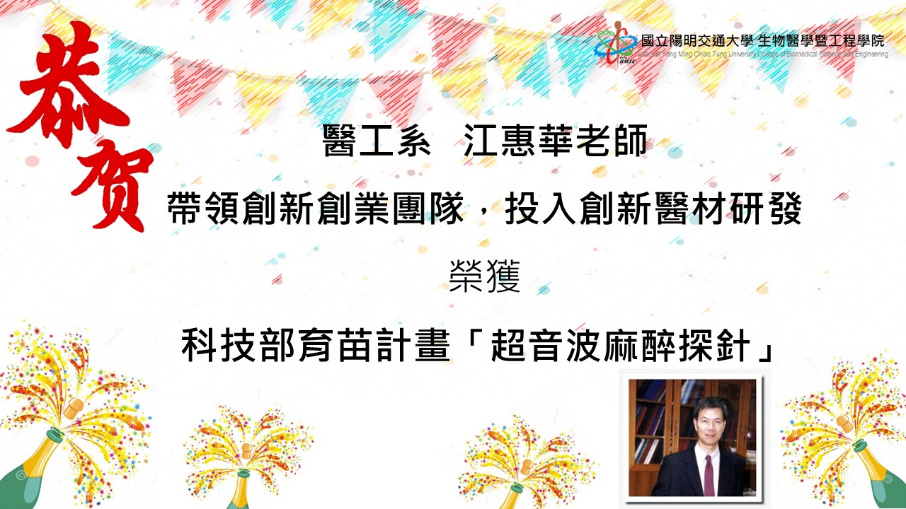 恭喜醫工系江惠華老師 帶領創新創業團隊投入創新醫材研發「超音波麻醉探針」榮獲 科技部育苗計畫
