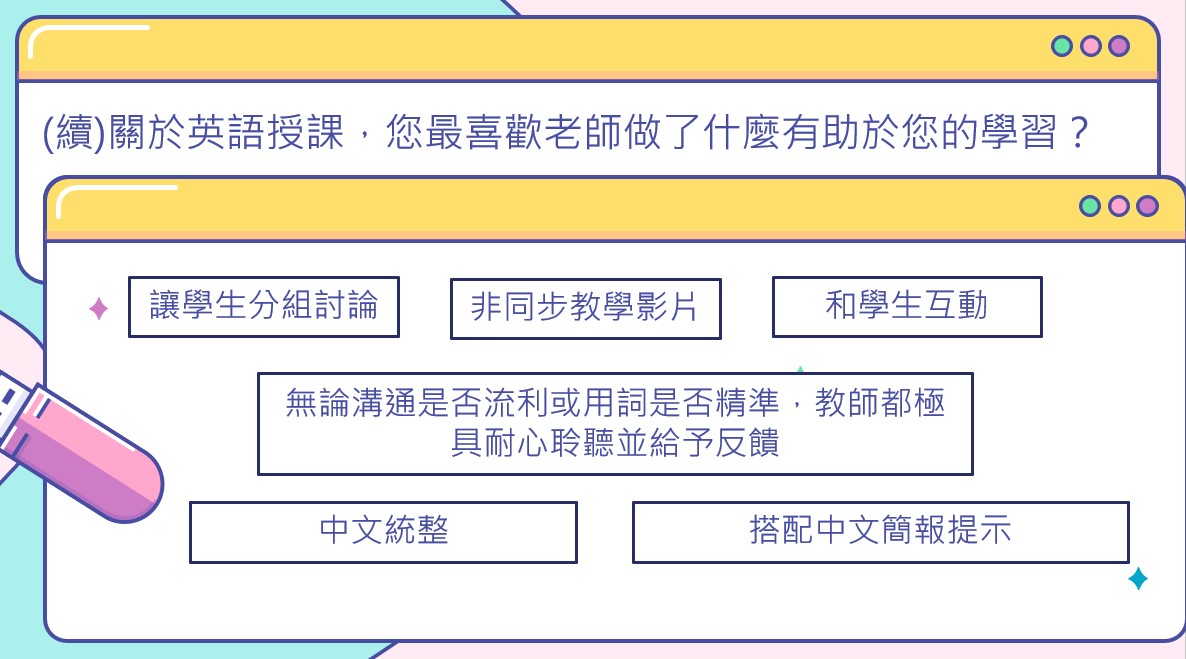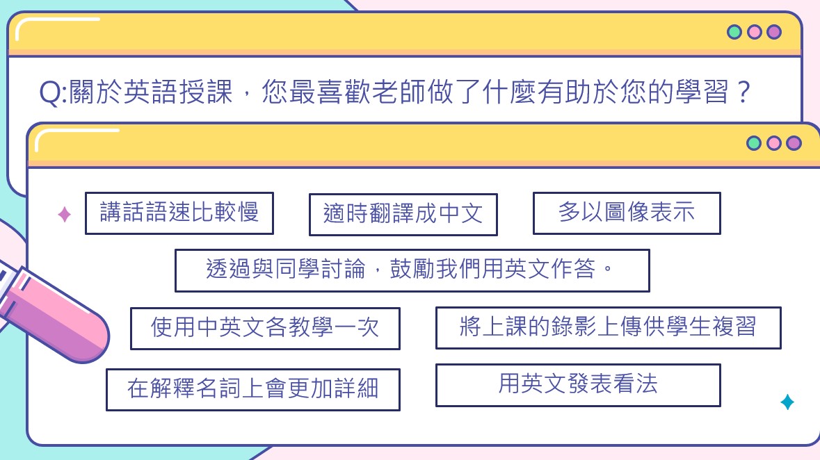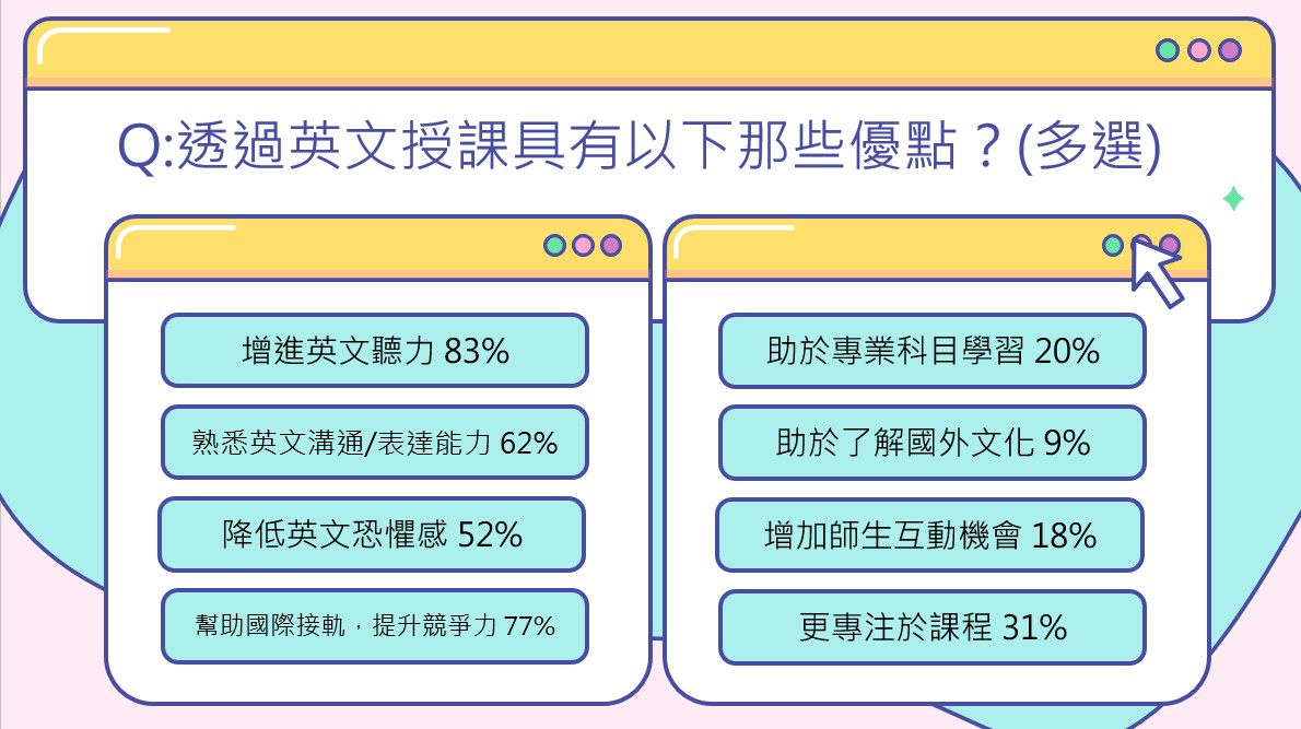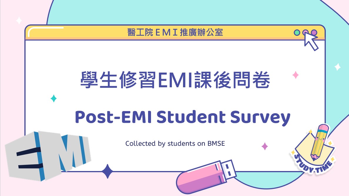 EMI課堂中學生認為老師講授使用英語進行的比例有多少% 透過EMI課程,學生認為的優點 學生對於EMI授課的學習成效 學生是否願意再修其他EMI課程 學生認為老師在教導EMI授課時有助於學習的地方 關於EMI授課,學生希望能得到的幫助