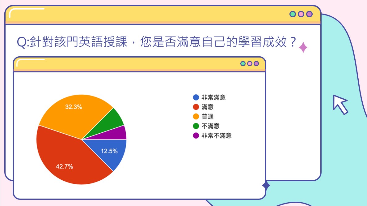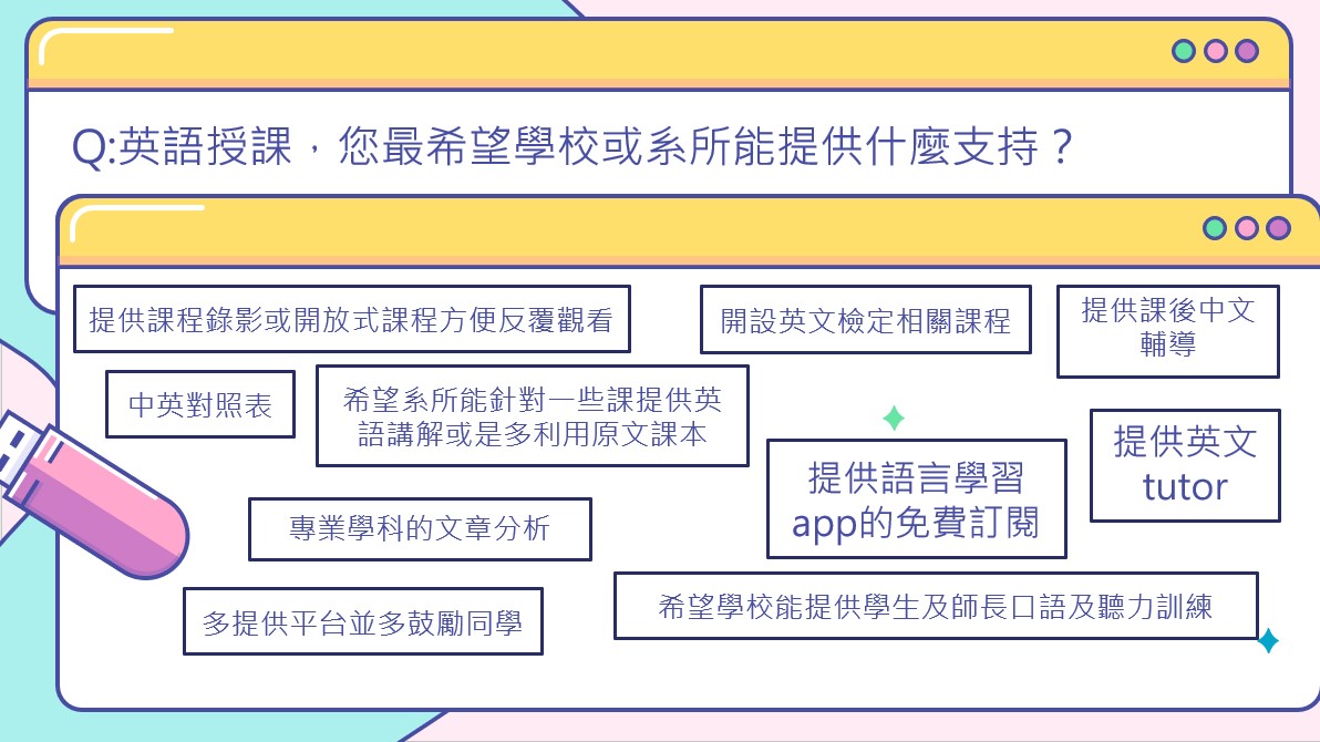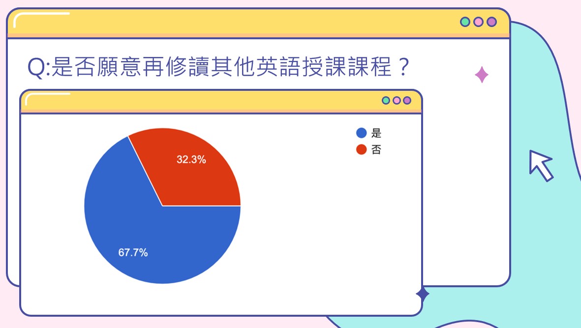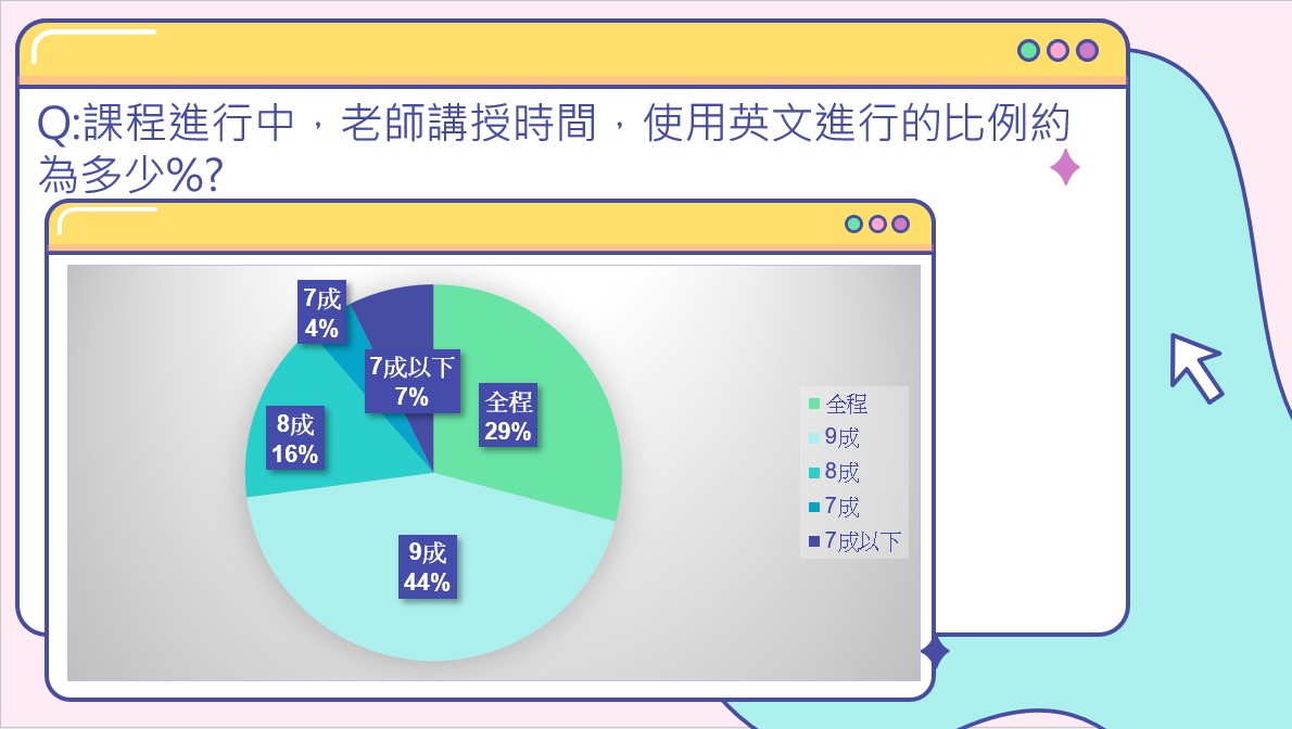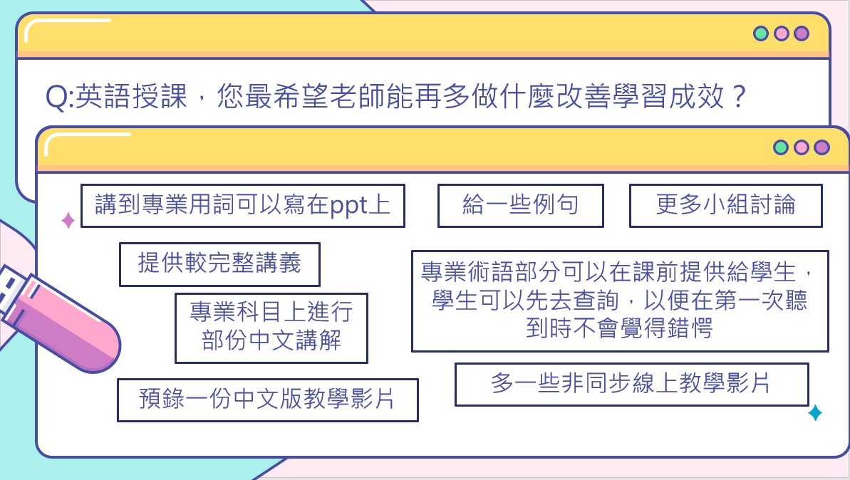 EMI課堂中學生認為老師講授使用英語進行的比例有多少% 透過EMI課程,學生認為的優點 學生對於EMI授課的學習成效 學生是否願意再修其他EMI課程 學生認為老師在教導EMI授課時有助於學習的地方 關於EMI授課,學生希望能得到的幫助